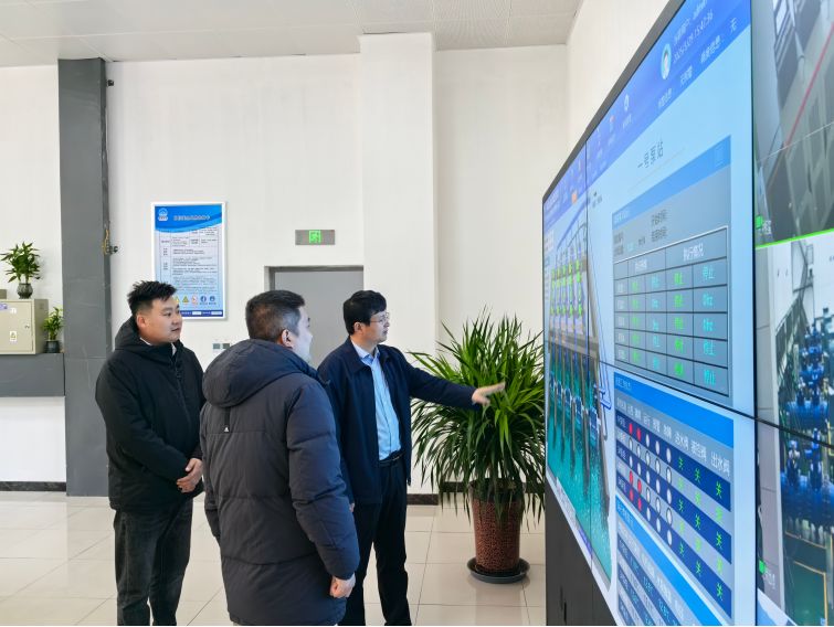 在一号泵站调度中心,通过数字孪生平台的实时演示,全面了解项目智能化管理系统的运行模式和数据应用效果。魏长学肯定了平台在优化调度、应急响应等方面的功能,并要求进一步强化技术赋能,提升水务管理的精细化水平。随后,在二号泵站现场查看主道路施工进展,详细询问道路施工的工期节点与难点及施工进度情况,要求工作人员加强监督与管理,在确保安全和质量的前提下,加快推进配套工程建设。最后来到三号泵站,查看了水泵机组及配套设备维护情况,检查了厂房土建防漏防潮措施,提出要加强巡查及日常点检,确保泵站各项工作安全进行。